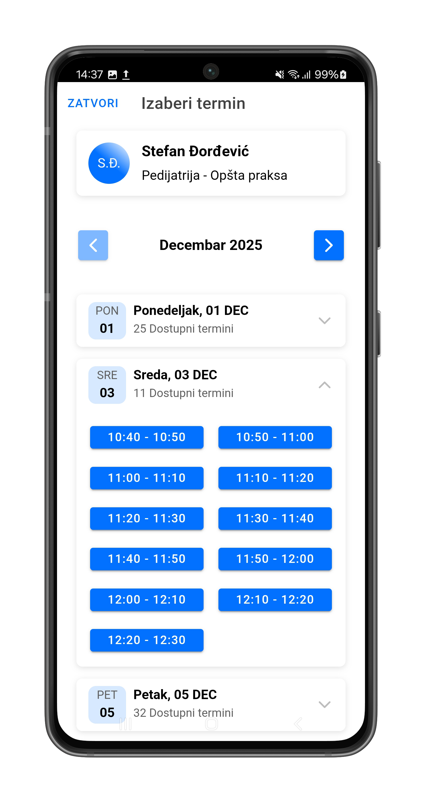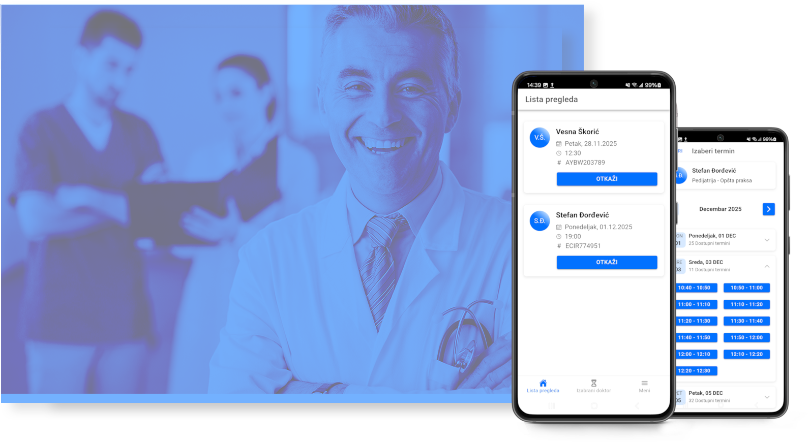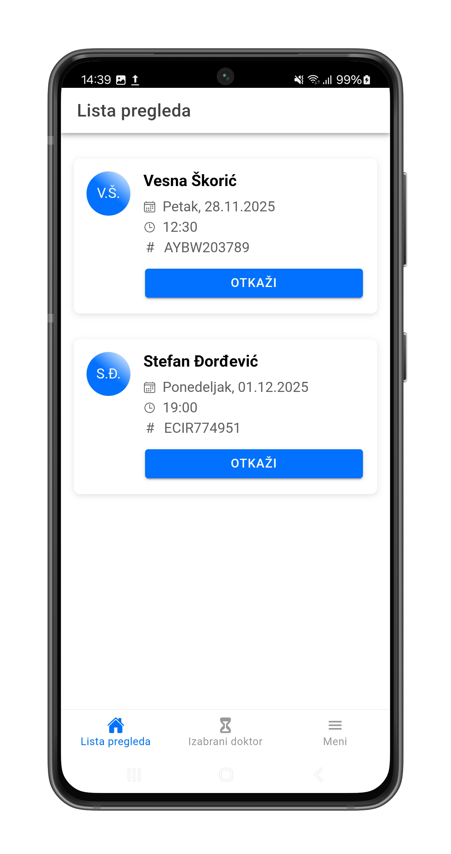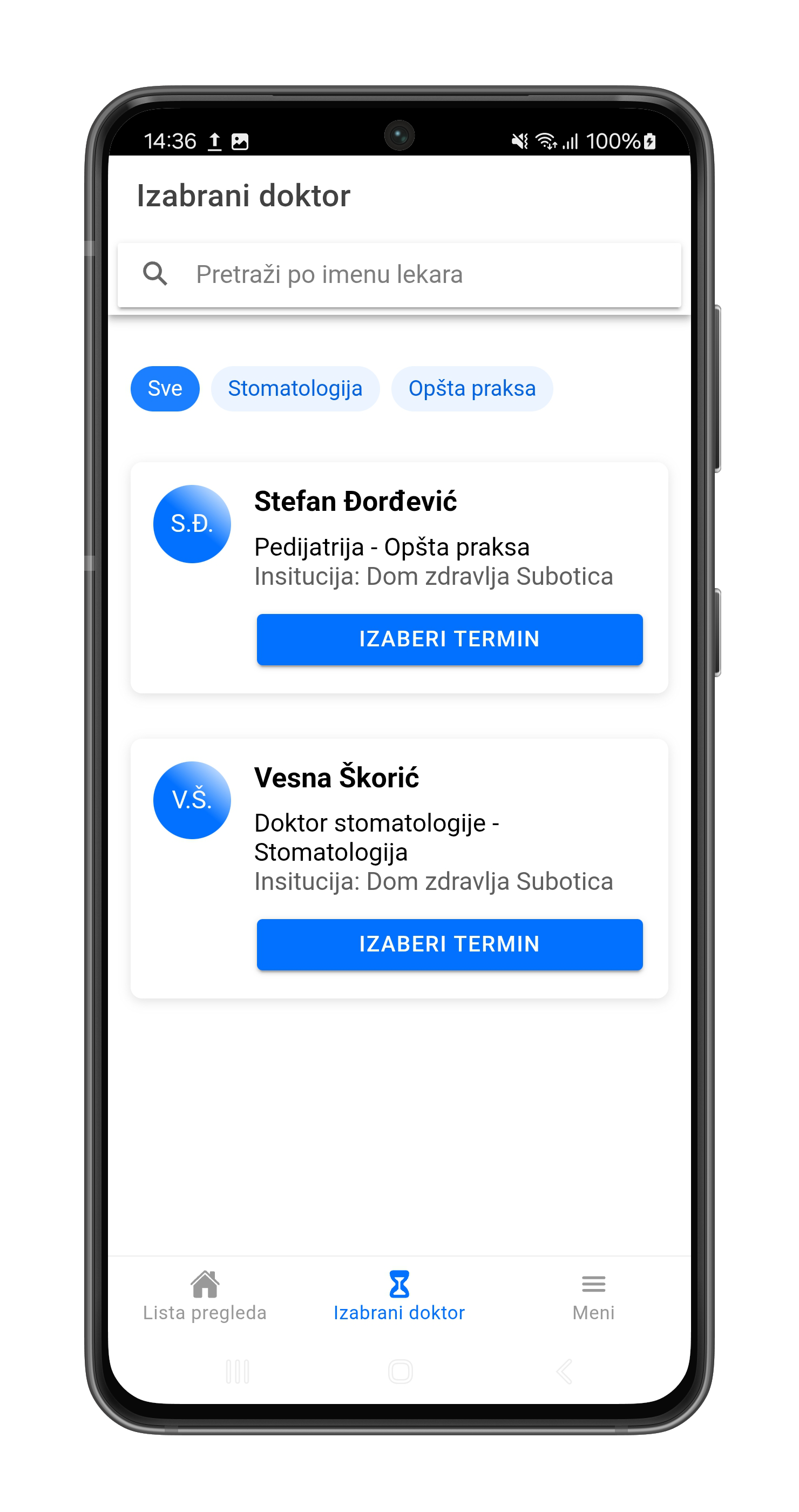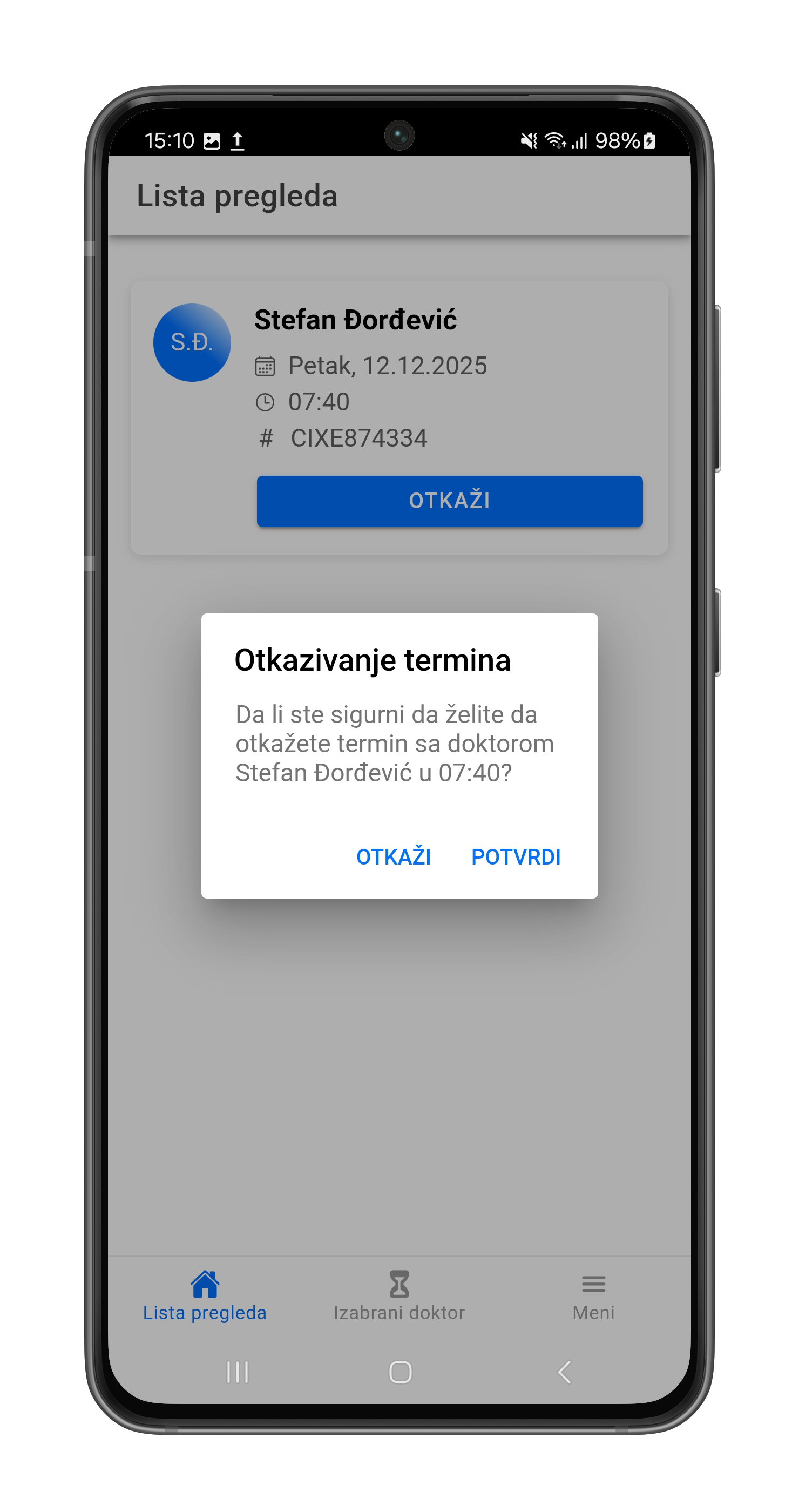 Sa liste slobodnih termina, izaberite željeni termin kako biste zakazali pregled kod izabranog lekara. Nakon potvrde, Vaš pregled je uspešno zakazan i isti je dostupan u listi pregleda.